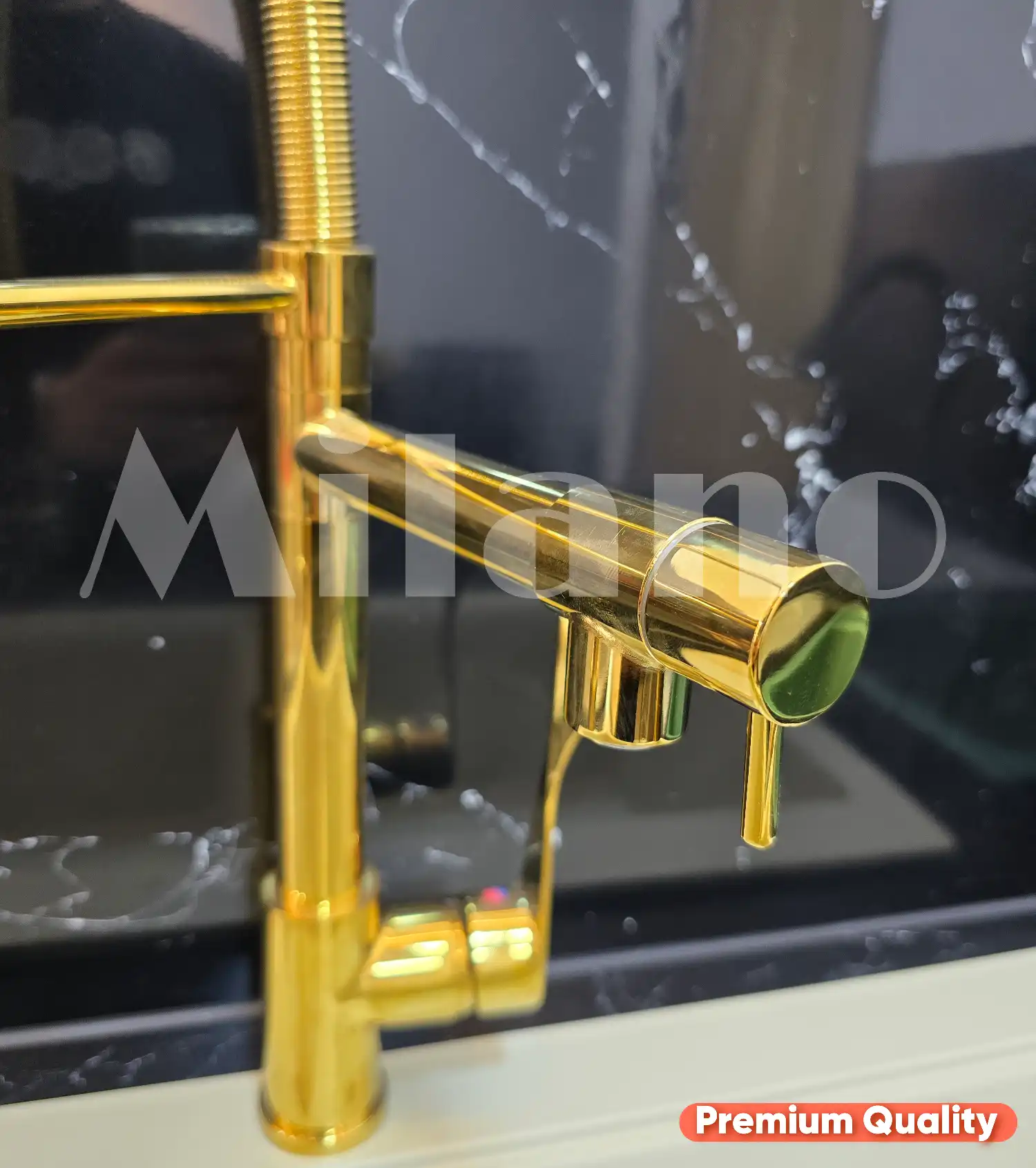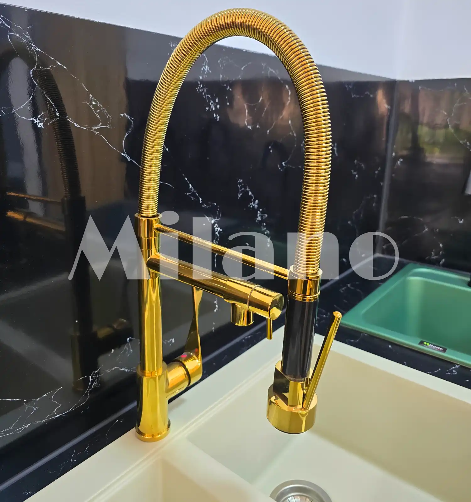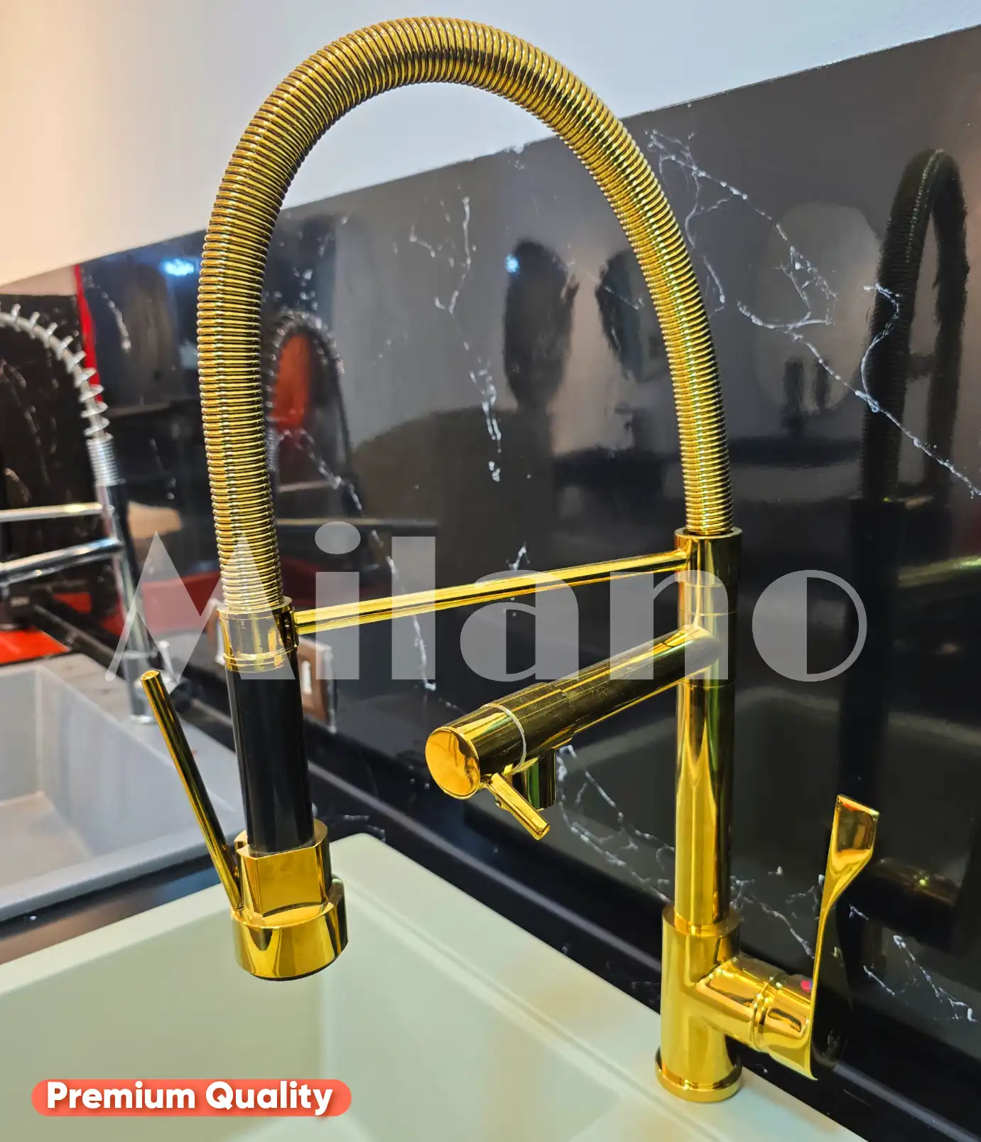 خلاط مطبخ شيف 2×1 ذهبي فاخر وعالي الجودة، يجمع بين حنفية ثابتة وحنفية مرنة لرش المياه، بطلاء مقاوم للصدأ والتقشير. مثالي للمطابخ العصرية.