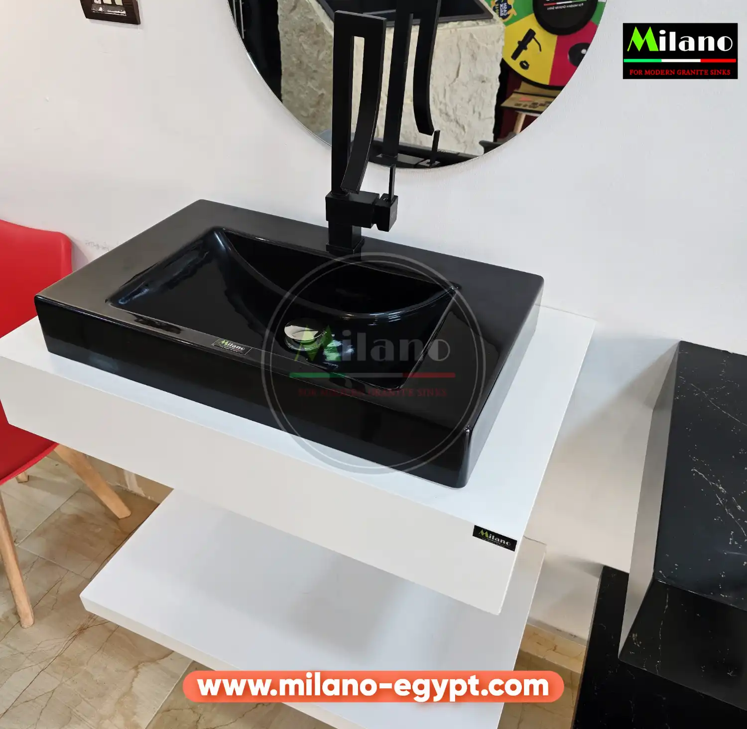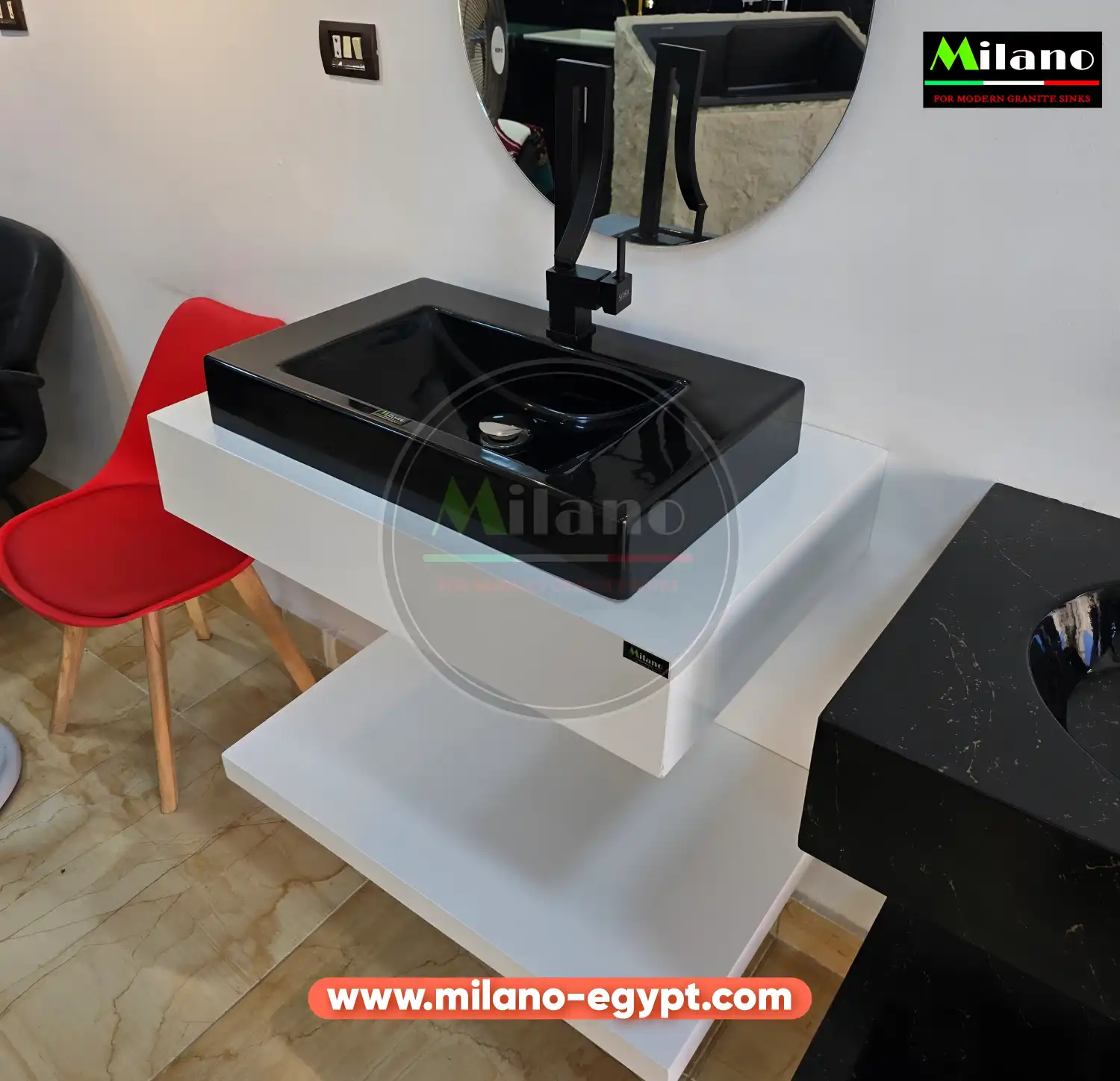 وحدة حمام فندقية بتصميم مودرن يجمع بين الوحدة البيضاء والحوض الأسود اللامع في تناسق راقٍ يضيف شخصية قوية لأي حمّام. مصنوعة من رخام صناعي بخامات أوروبية لضمان المتانة والفخامة.