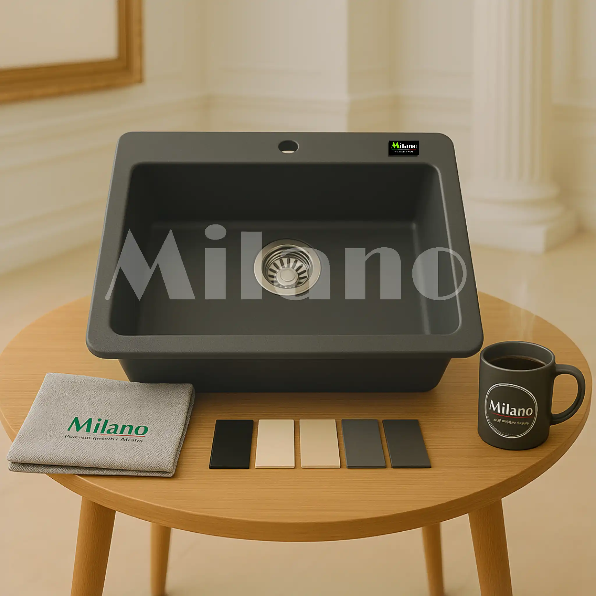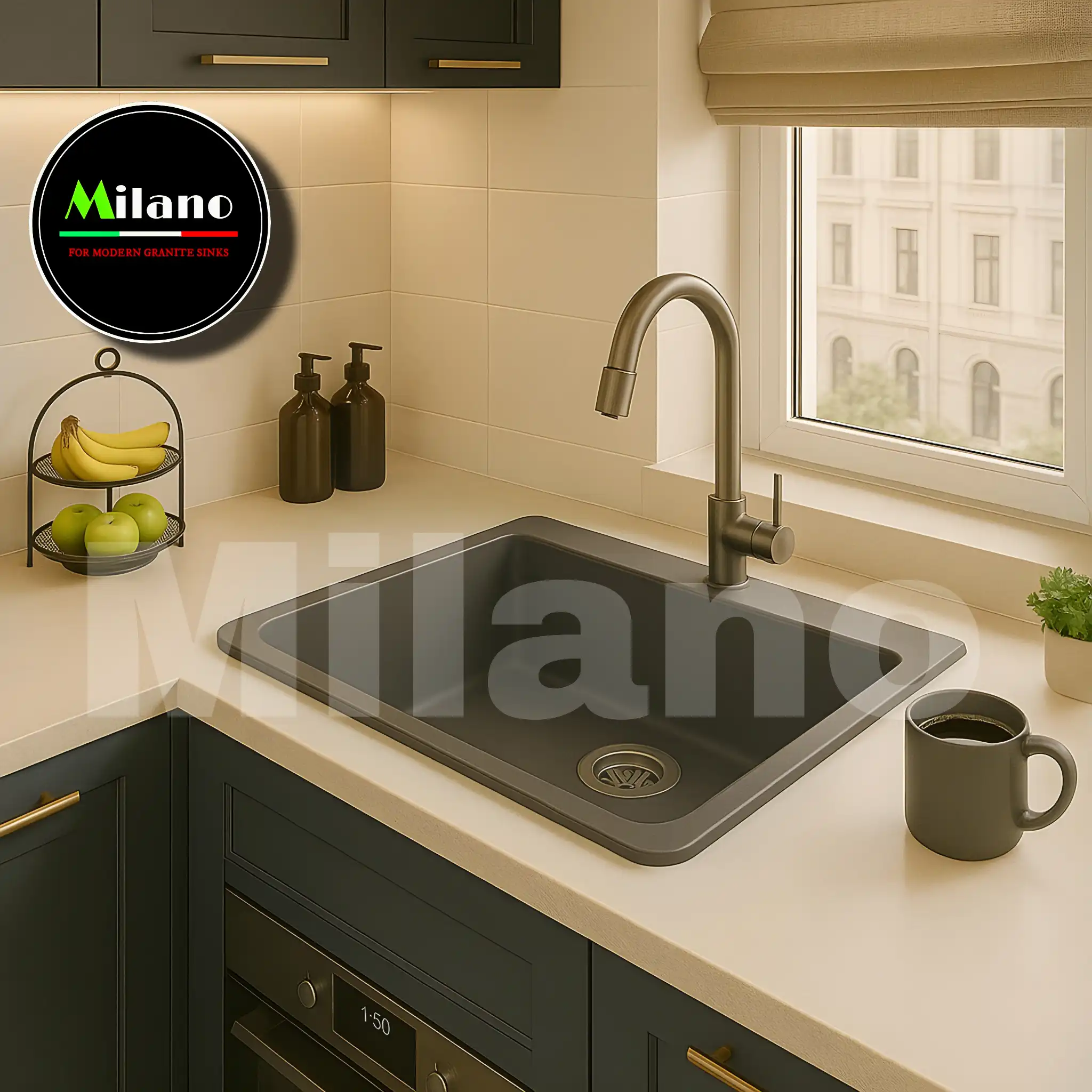 حوض مطبخ جرانيت 60×50 رمادي من ميلانو إيجيبت – مقاوم للبقع والخدوش، تصميم عصري يناسب المطابخ المودرن.