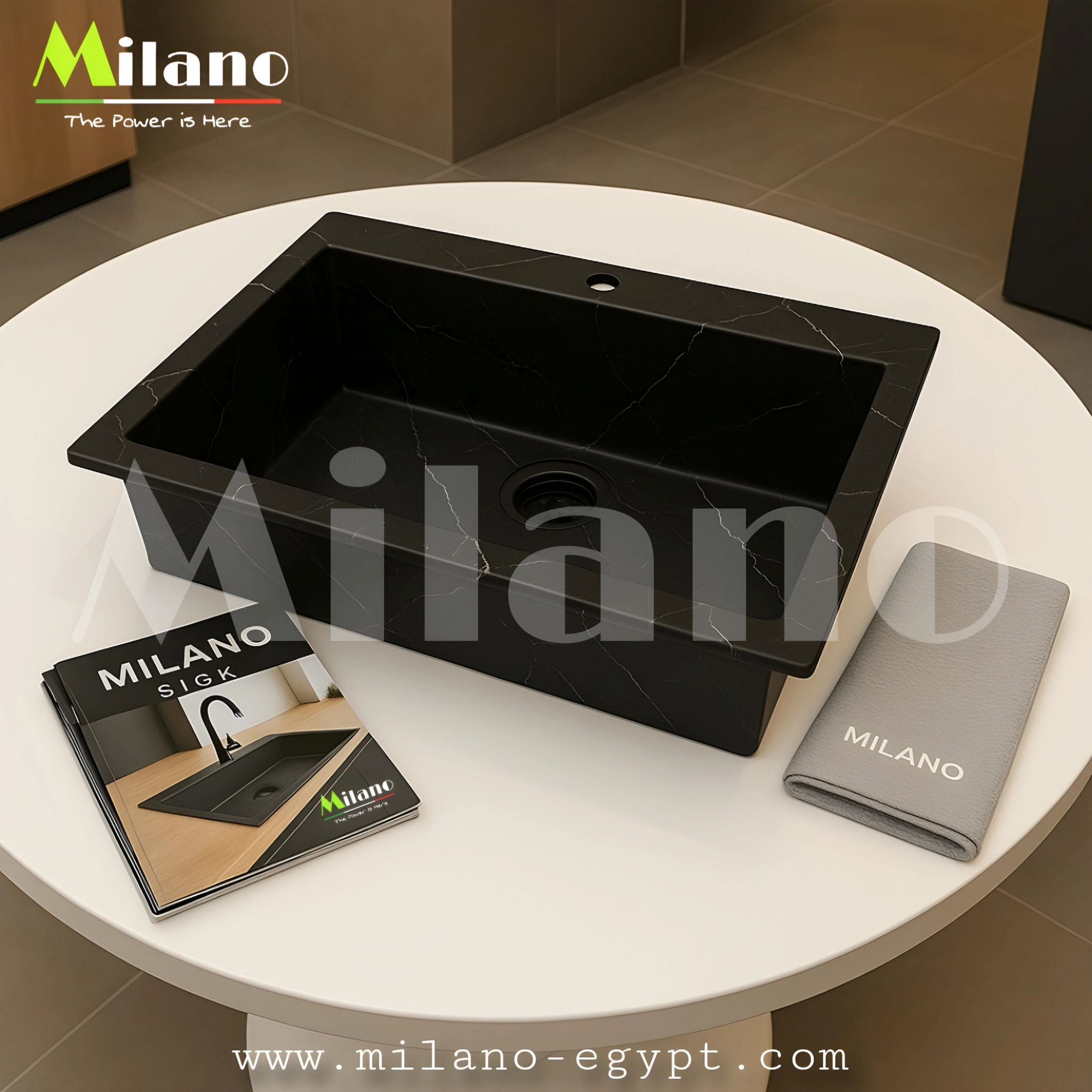 أشتري حوض مطبخ جرانيت 70×50 باللون الأسود في ابيض مع عروق رخامية بيضاء من ميلانو إيجيبت – تصميم أنيق، مقاوم للحرارة وسهل التنظيف، مثالي للمطابخ الحديثة.