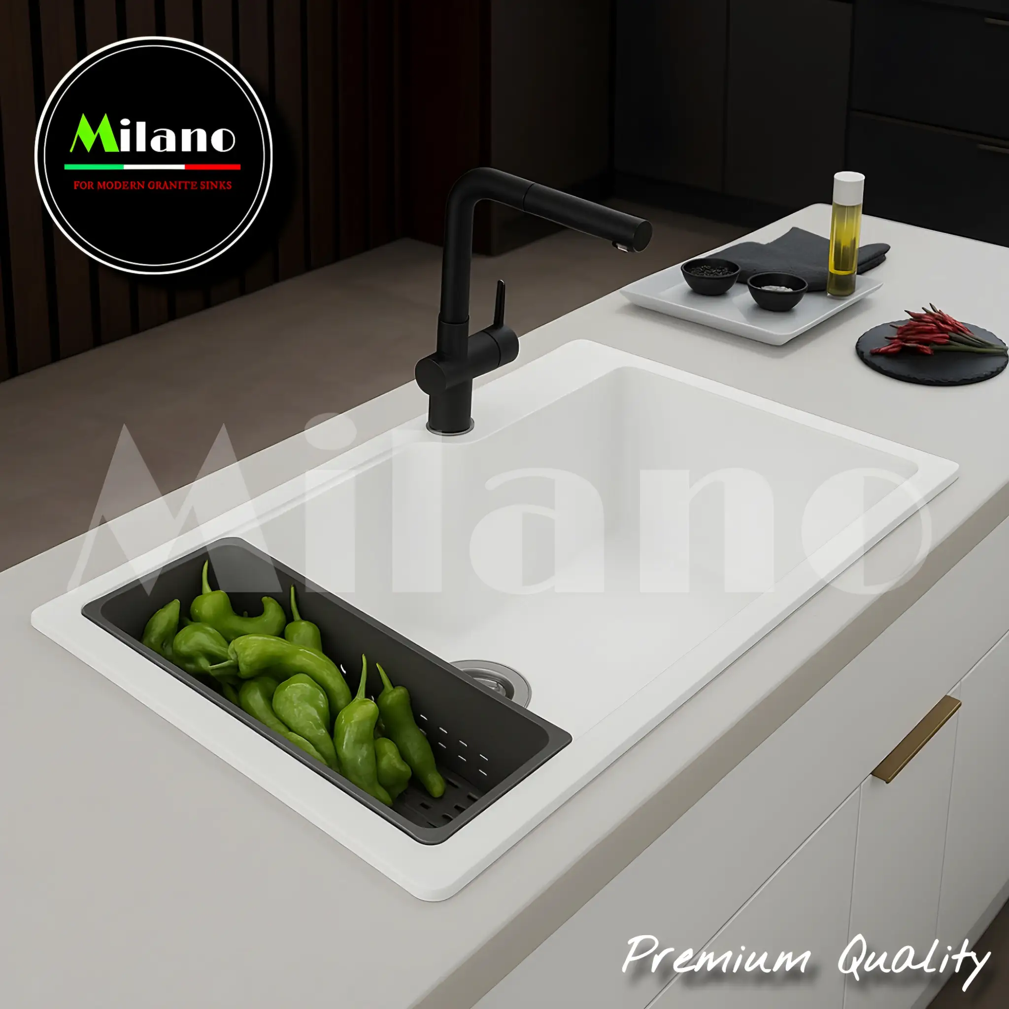 حوض المطبخ الجرانيت نسخة فرانكي مقاس 78×50 لون أبيض مط بالصرف 5 ملي من ميلانو