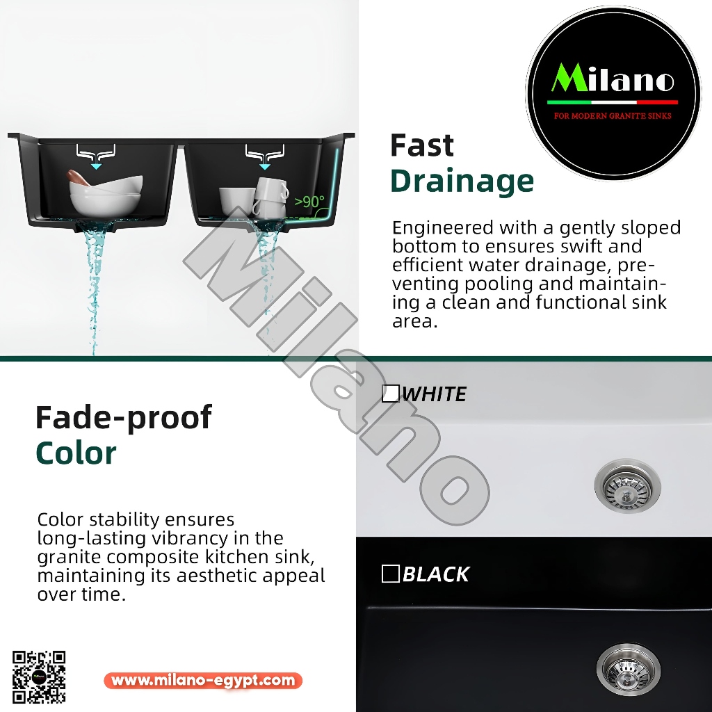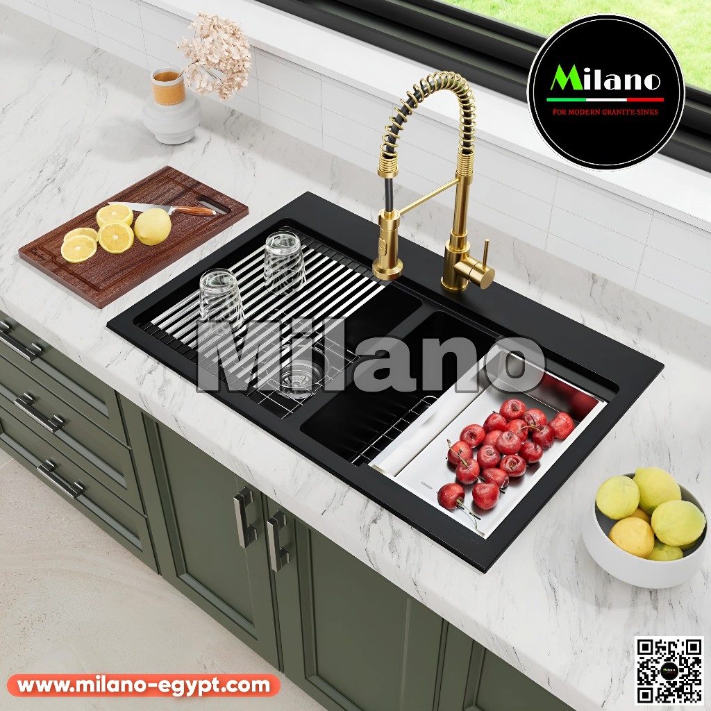 أشتري حوض مطبخ جرانيت 80×50 اتنين عين باللون الأسود من ميلانو إيجيبت – تصميم أنيق، مقاوم للحرارة وسهل التنظيف، مثالي للمطابخ الحديثة. غير قابل للخدش والتجريح.