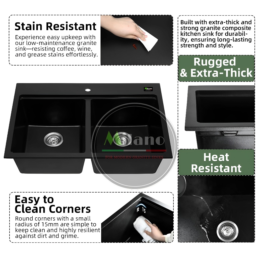 حوض مطبخ جرانيت جراي غامق مط اتنين عين بتكنولوجيا الكربون الغير قابل للخدش والتجريح مقاس 80×50 اتنين عين