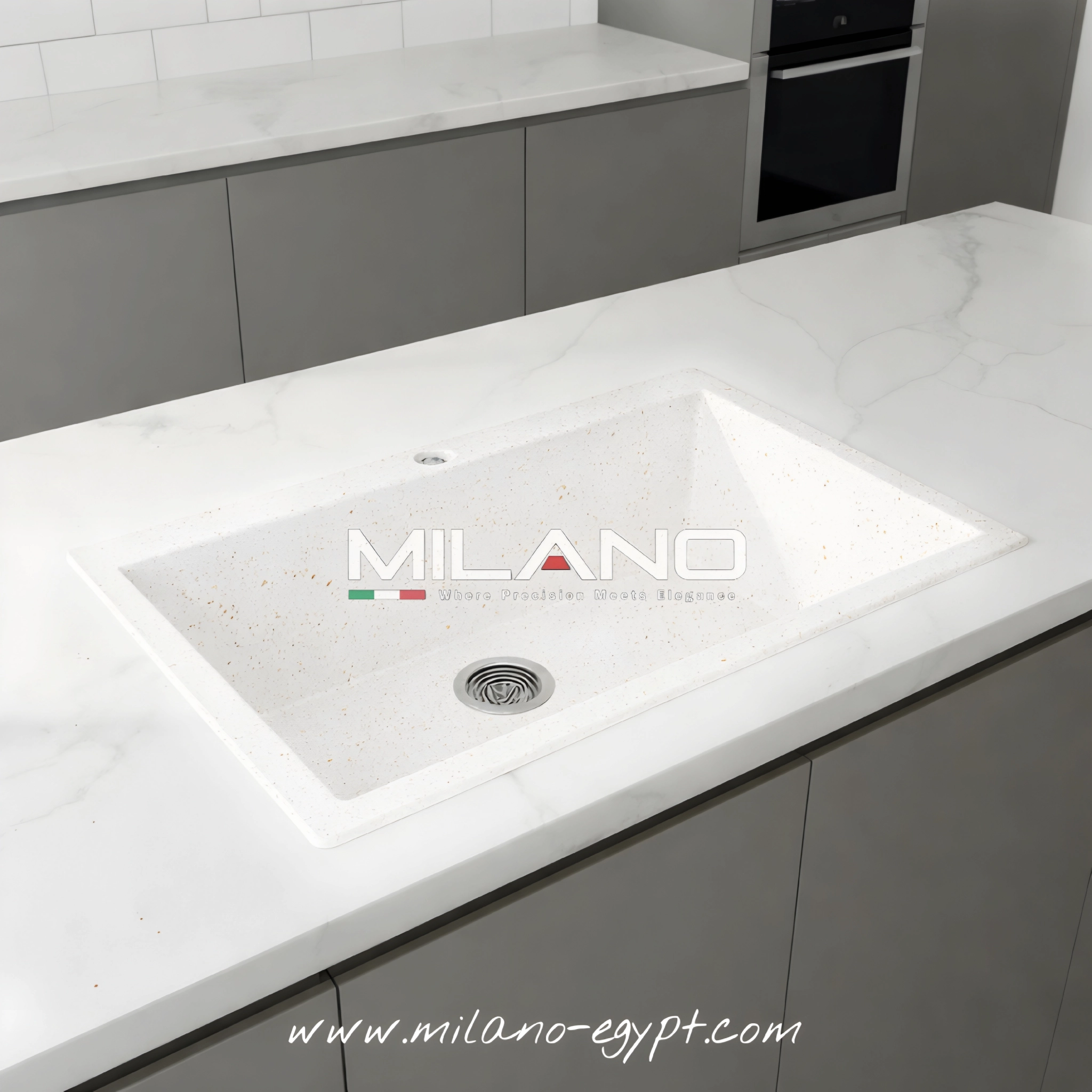 أشتري حوض مطبخ جرانيت 80×50 أبيض مع حبيبات البيرجمون من ميلانو إيجيبت – تصميم أنيق، مقاوم للحرارة وسهل التنظيف، مثالي للمطابخ الحديثة.