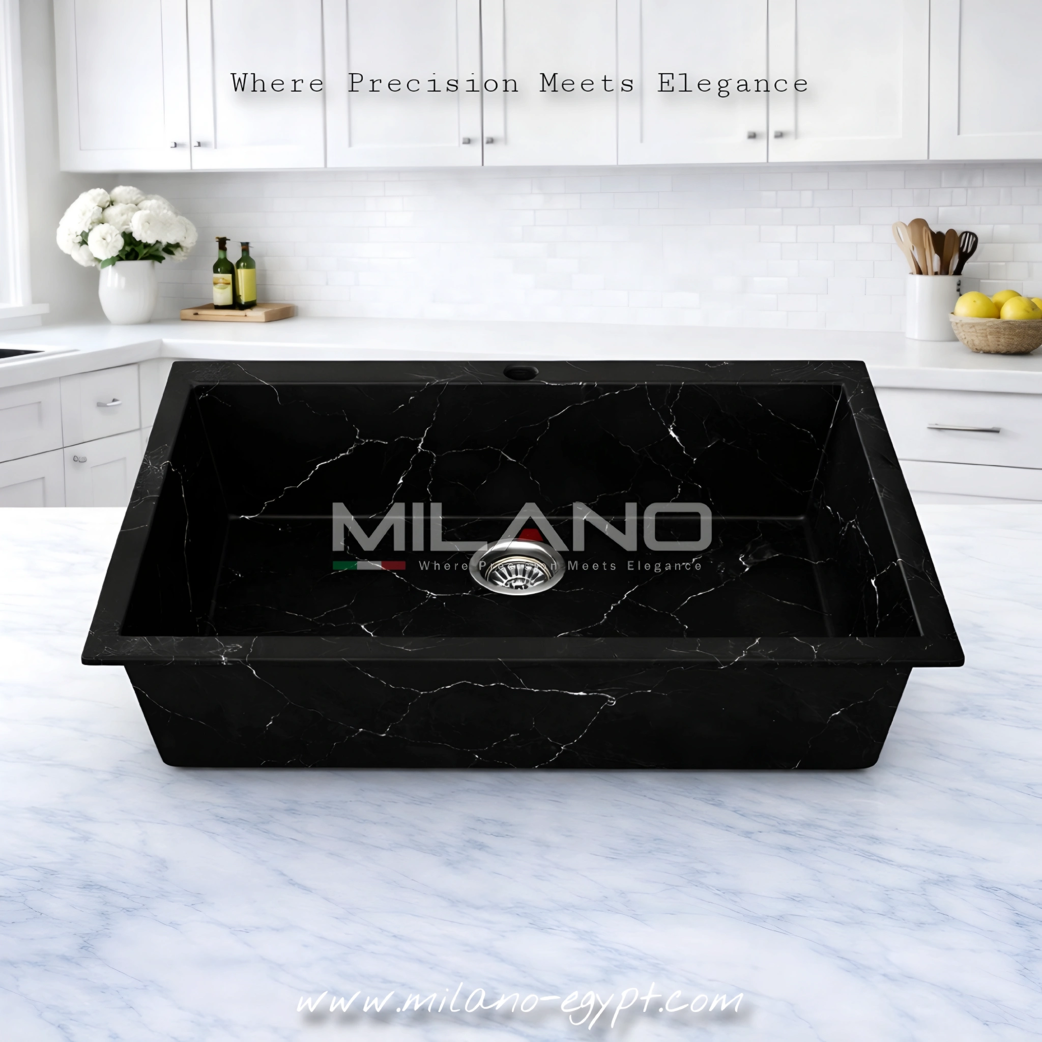 أشتري حوض مطبخ جرانيت 85×50 باللون الأسود في ابيض مع عروق رخامية بيضاء مط من ميلانو إيجيبت – تصميم أنيق، مقاوم للحرارة وسهل التنظيف، مثالي للمطابخ الحديثة.