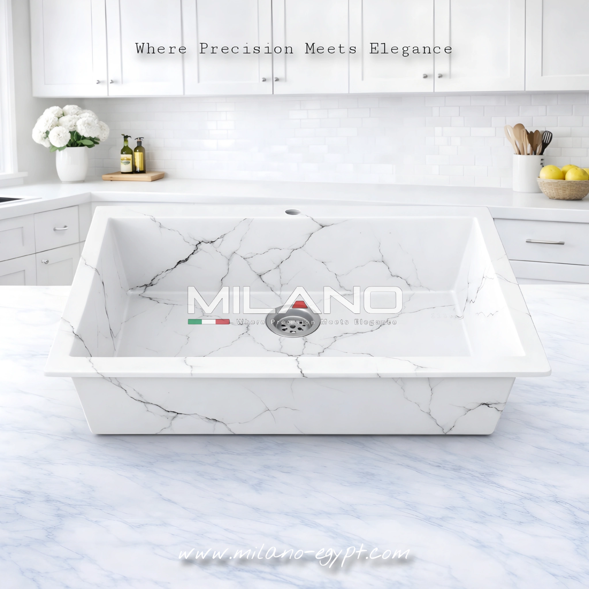 أشتري حوض مطبخ جرانيت 85×50 أبيض في اسود مع عروق رخامية سوداء من ميلانو إيجيبت – تصميم أنيق، مقاوم للحرارة وسهل التنظيف، مثالي للمطابخ الحديثة. غير قابل للخدش.